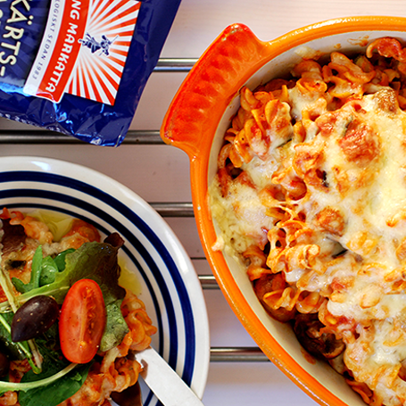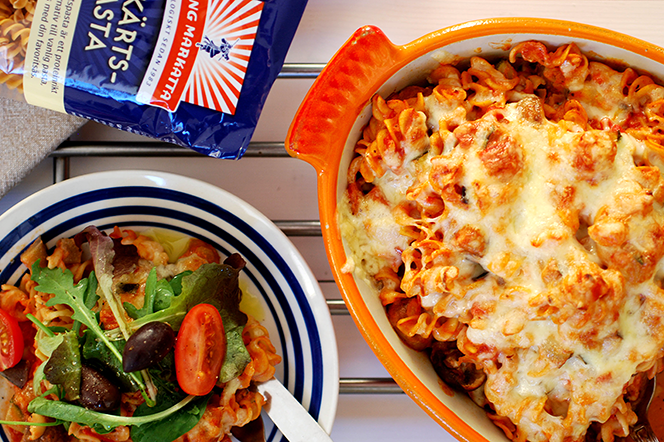 Denna pastagratäng har en bas av kikärtspasta samt härliga grönsaker som aubergine och zucchini. En god vardagsrätt eller bjudrätt som även smakar lika bra i lunchlådan. Servera med en sallad och ringla över olivolja med citronzest för en lyxigare touch!