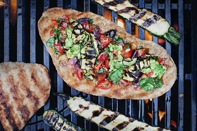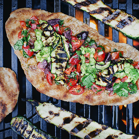 Syrligt, kryddigt, krämigt och varmt – det här är en smakexplosion på grillen och en riktig sommarhit. De pizzaliknande fullkornstunnbröden bakas direkt på gallret tills de blir härligt knapriga och toppas sen med en stark, chilensk koriander- och tomatsås, krämig avokado och grillad zucchini. Eftersom de först grillas utan topping får bröden en frasigare konsistens än vanliga pizzor.