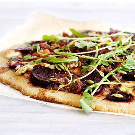 Detta är en fantastiskt god pizza med rödbetor, getost, honung och valnötter. passar perfekt som en middag toppad med fräsch rucolasallad och ärtskott men fungerar lika bra som drinktilltugg eller på buffébordet, uppskuren i små bitar.