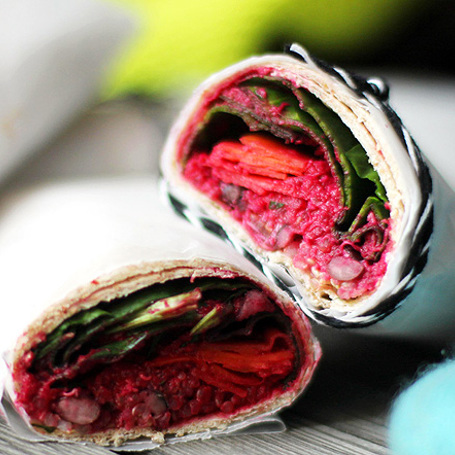 Fyll ryggsäcken med ett gäng wraps och ge er ut på en rustik skogsutflykt! Denna rubinröda variant med rödbetshummus och en kryddig quinoa är både söt och syrlig och omåttligt populär både bland stora som små!