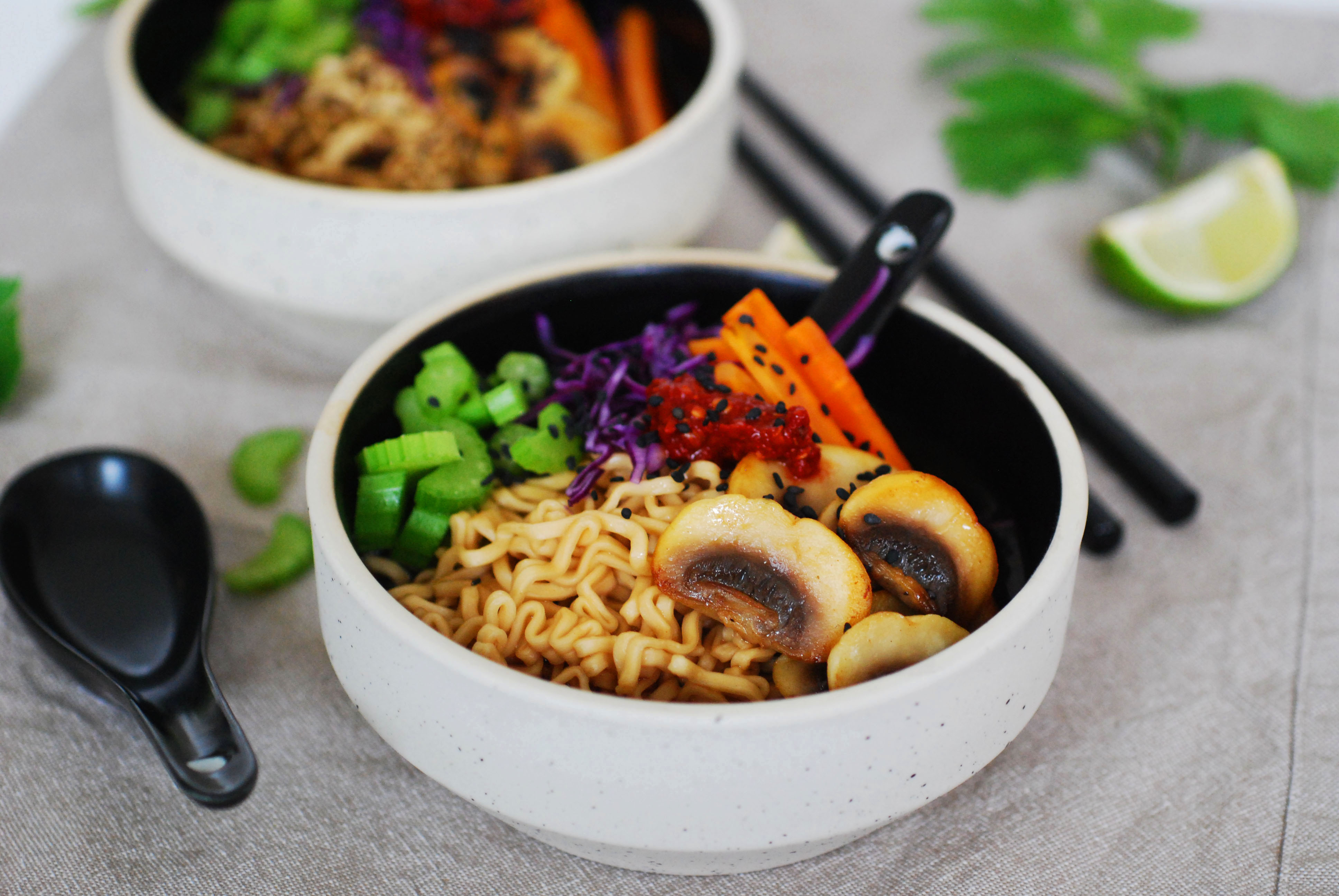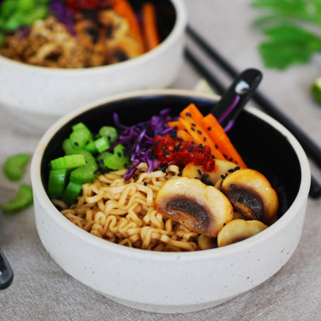 Koka nudlarna enligt förpackningens anvisningar i buljongen. Fräs champinjoner och morotsstavar i olja tills de får färg. Häll upp nudlar och buljong i skålar, toppa med rödkål, champinjoner, morot, selleri och lite sambal oelek. Avsluta med att strö över sesamfrön. Servera gärna en limeklyfta till soppan.