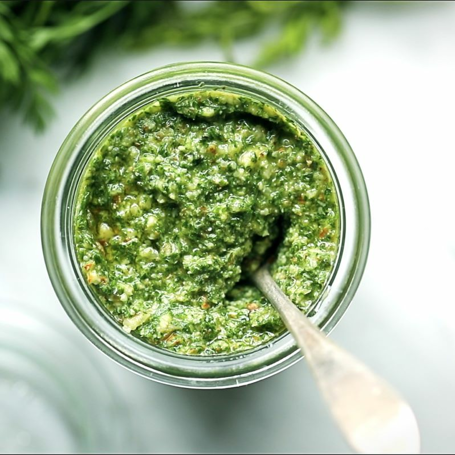 Säsongsmorötter har en lång, grön blast som brukar hamna i komposten. Men vet du vad? Den funkar jättebra i pesto! Använd den till kvällens pasta eller vänd rostade morötter i en pesto gjord på sin egen blast. Du kan också testa att vända ner en miniskvätt lönnsirap i peston för extra smarrighet.
