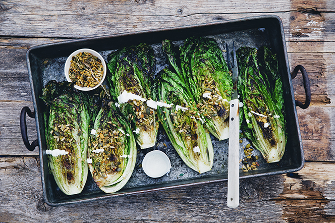 Denna snabbgrillade sallad med knaprig dijongranola och krämig sås är superenkel att göra. Den passar perfekt som förrätt eller sidorätt. Genom att bara bränna av ena sidan av salladen får man fram nya smakdimensioner och spännande texturmöten då det sotigt mjuka och karamelliserade möter det krispigt fräscha. Till skillnad från vanlig majonnäs, görs denna krämiga veganvariant på 30 sekunder med en stavmixer, inget vispande behövs!